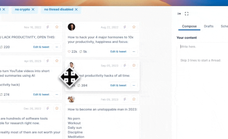 Tweethunter comes with it’s insane chrome extension that allows you to see your favorite accounts best performing content and also search for keywords.