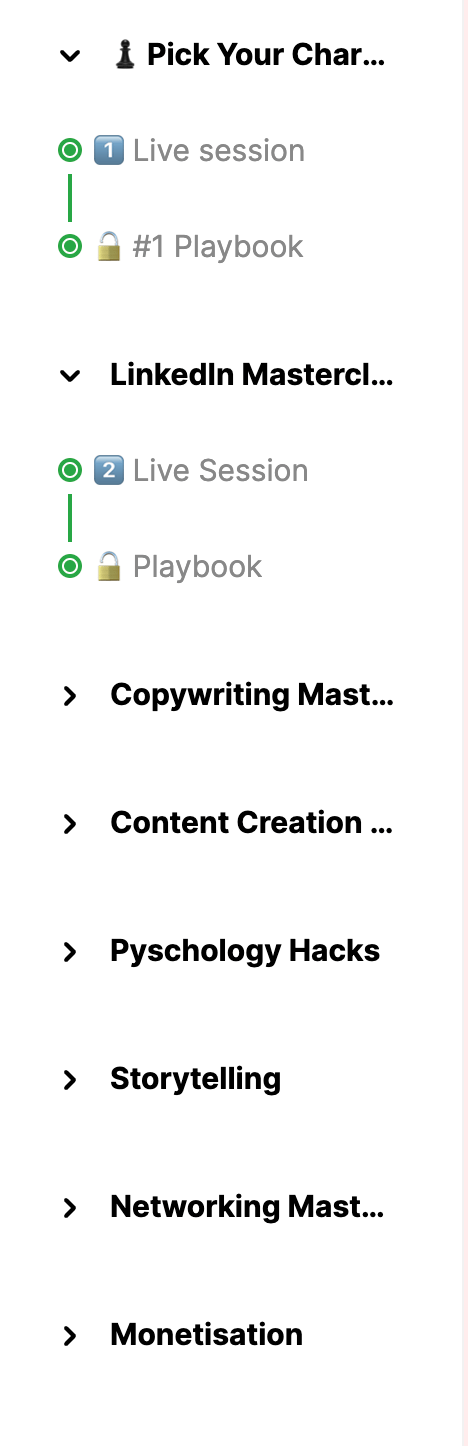 The cohort is focused on Linkedin personal branding, however, there’s only one or two modules focusing on it. The rest is the unspoken secrets that NO ONE talks about. Psychology, persuasion, storytelling, sales, charisma… etc. THAT.